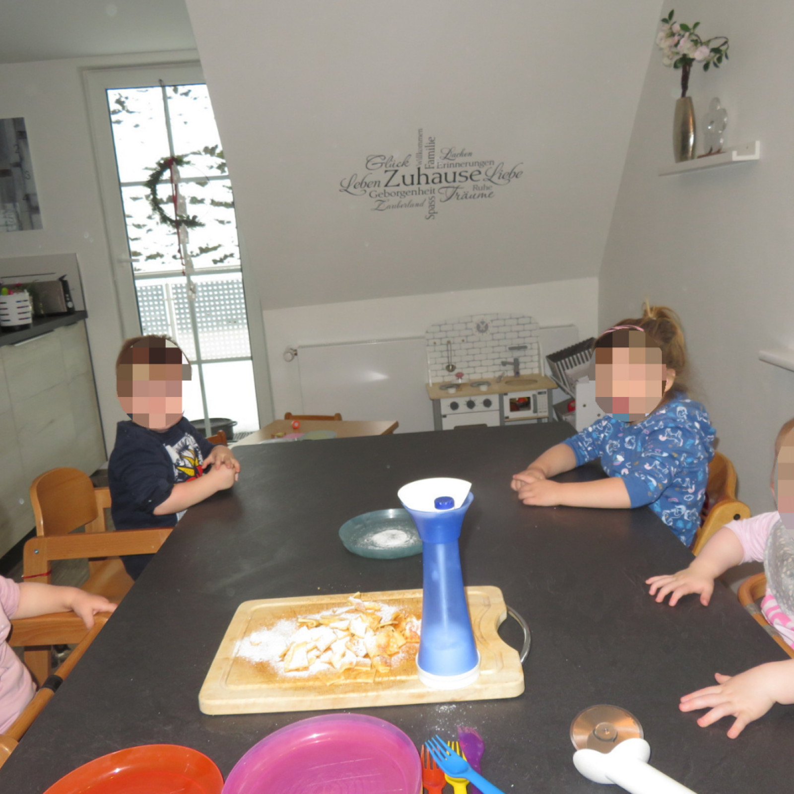 Essen und Trinken nimmt in der Kindertagespflege einen großen zeitlichen Anteil ein – über den Tag verteilt sind es mehrere Mahlzeiten, die wir gemeinsam zu uns nehmen. Eine kindgerechte Ernährung ist für die gesunde Entwicklung wichtig. Beim Essen lernt das Kind verschiedene Lebensmittel und Geschmacksrichtungen kennen. Die Kinder können sich dazu die Zeit nehmen, die sie brauchen und auch selbst entscheiden was und wieviel sie von den angebotenen Speisen essen. Gerne gehe ich auf individuelle Ansprüche ein, wenn es Allergien oder sonstige persönliche Vorgaben gibt.